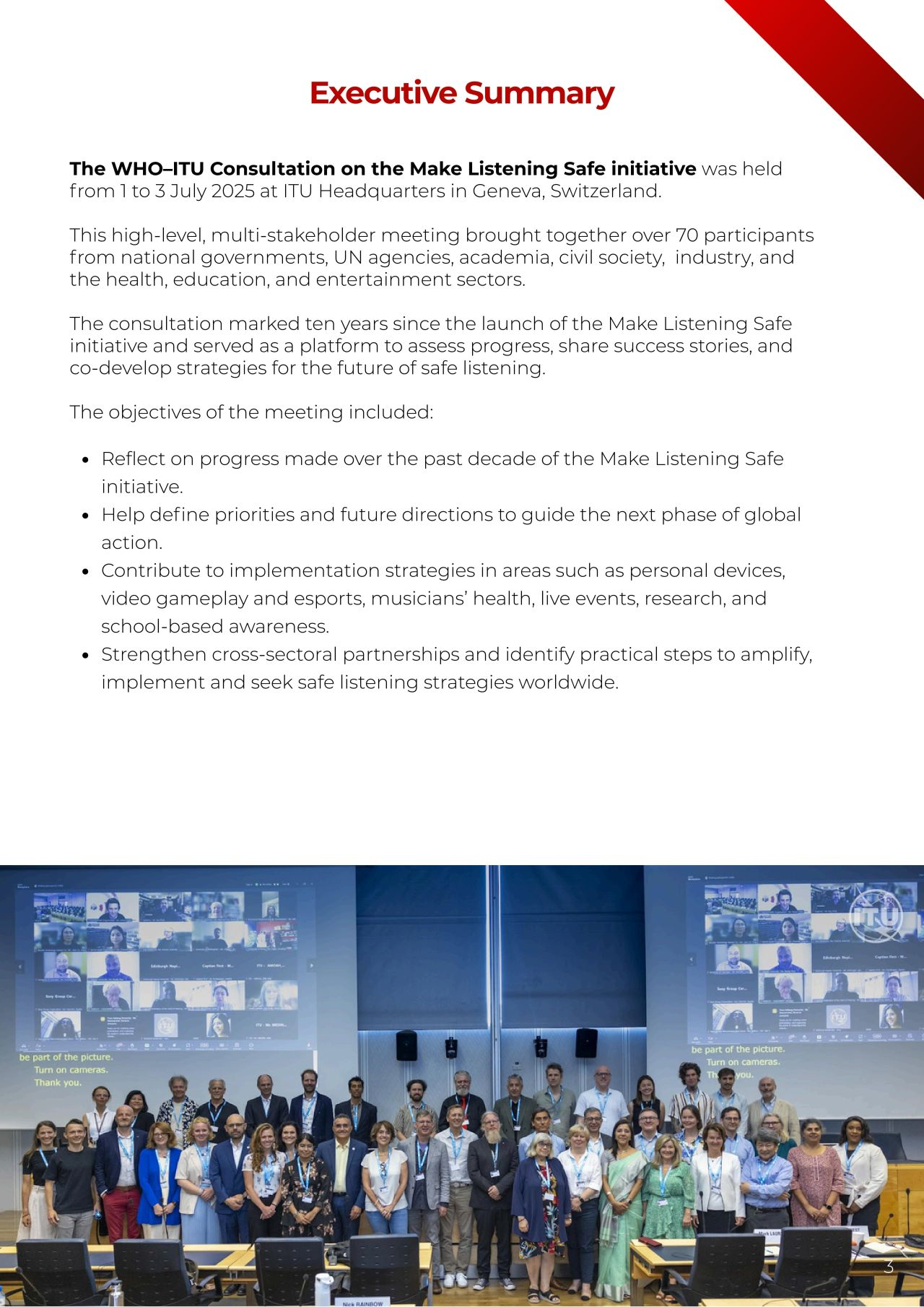 The meeting brought together more than 70 participants from national governments, UN agencies, academia, civil society, industry, and the health, education, and entertainment sectors. Discussions focused on the global prevalence of hearing loss—impacting 1.5 billion people worldwide—particularly among young people. Much of this hearing loss is caused by preventable factors, such as unsafe exposure to loud sounds.